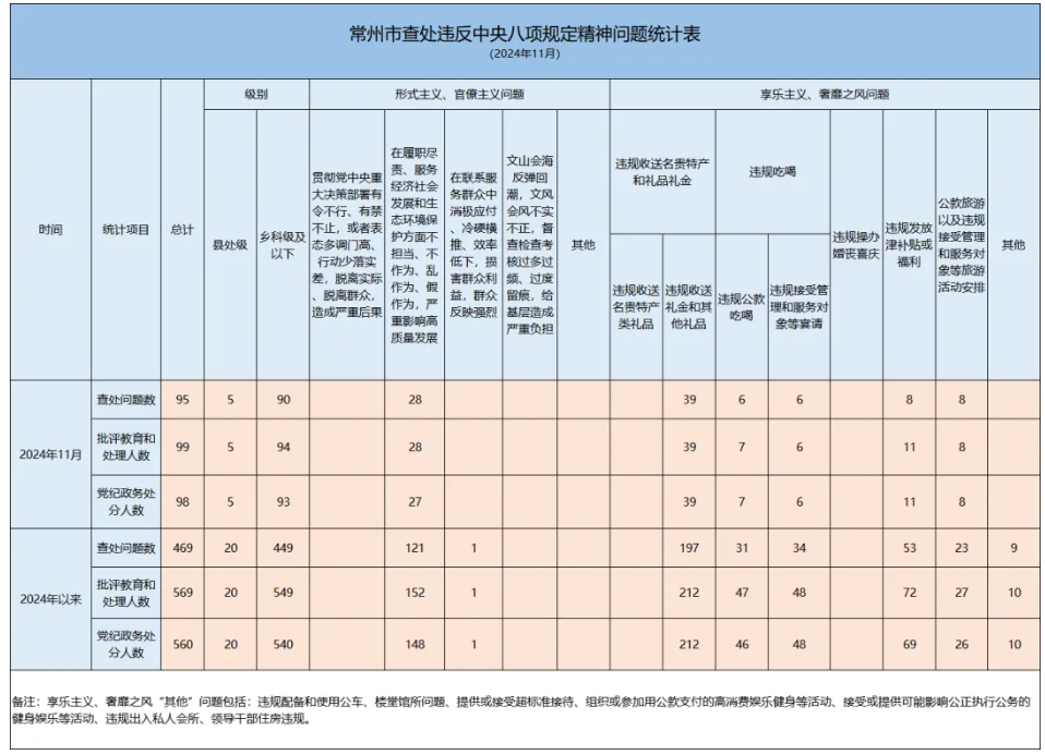 2024年11月,全市各级纪检监察机关共查处违反中央八项规定精神问题95起,其中查处形式主义、官僚主义问题28起,查处享乐主义、奢靡之风问题67起。批评教育和处理99人,其中给予党纪政务处分98人。从人员级别看,批评教育和处理县处级干部5人,乡科级及以下人员94人。