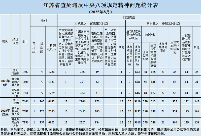 2025年8月,全省共查处违反中央八项规定精神问题1307起,批评教育和处理1400人、其中给予党纪政务处分1351人。从问题类型看,查处形式主义、官僚主义问题386起、批评教育和处理421人,查处享乐主义、奢靡之风问题921起、批评教育和处理979人。从人员级别看,批评教育和处理县处级干部77人、乡科级及以下人员1323人。