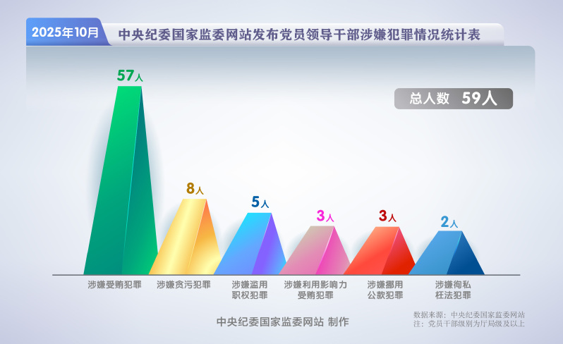 2025年10月,中央纪委国家监委网站发布的党纪政务处分信息中,59名被处分党员、干部均构成严重职务违法,57人被指涉嫌受贿犯罪,8人被指涉嫌贪污犯罪,5人被指涉嫌滥用职权犯罪,3人被指涉嫌利用影响力受贿犯罪,3人被指涉嫌挪用公款犯罪,2人被指涉嫌徇私枉法犯罪,其他还有涉嫌隐瞒境外存款罪、巨额财产来源不明罪、违法发放贷款罪等。