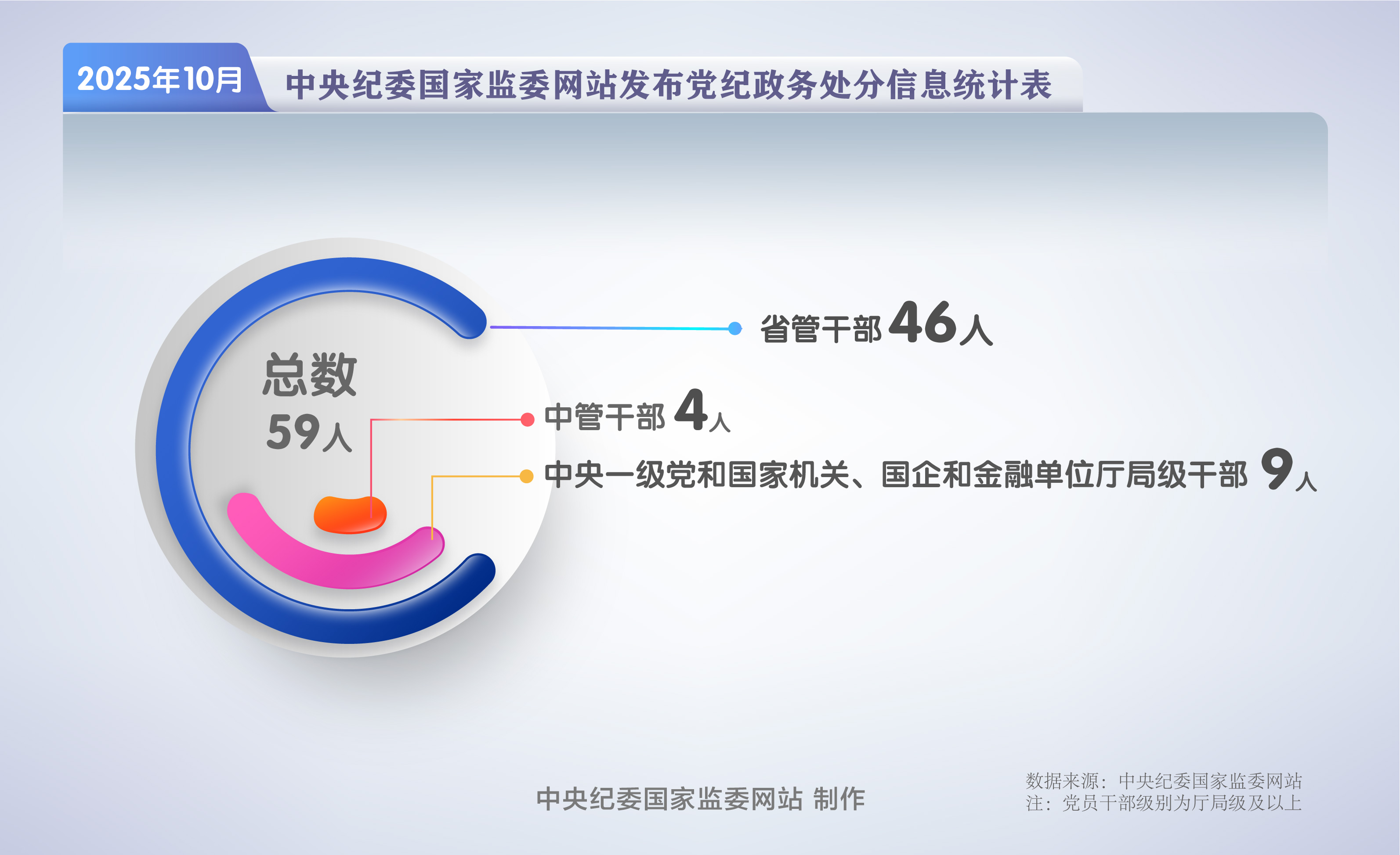 2025年10月,中央纪委国家监委网站共发布59名党员、干部党纪政务处分信息。其中,中管干部4名,中央一级党和国家机关、国企和金融单位厅局级干部9名,省管干部46名。