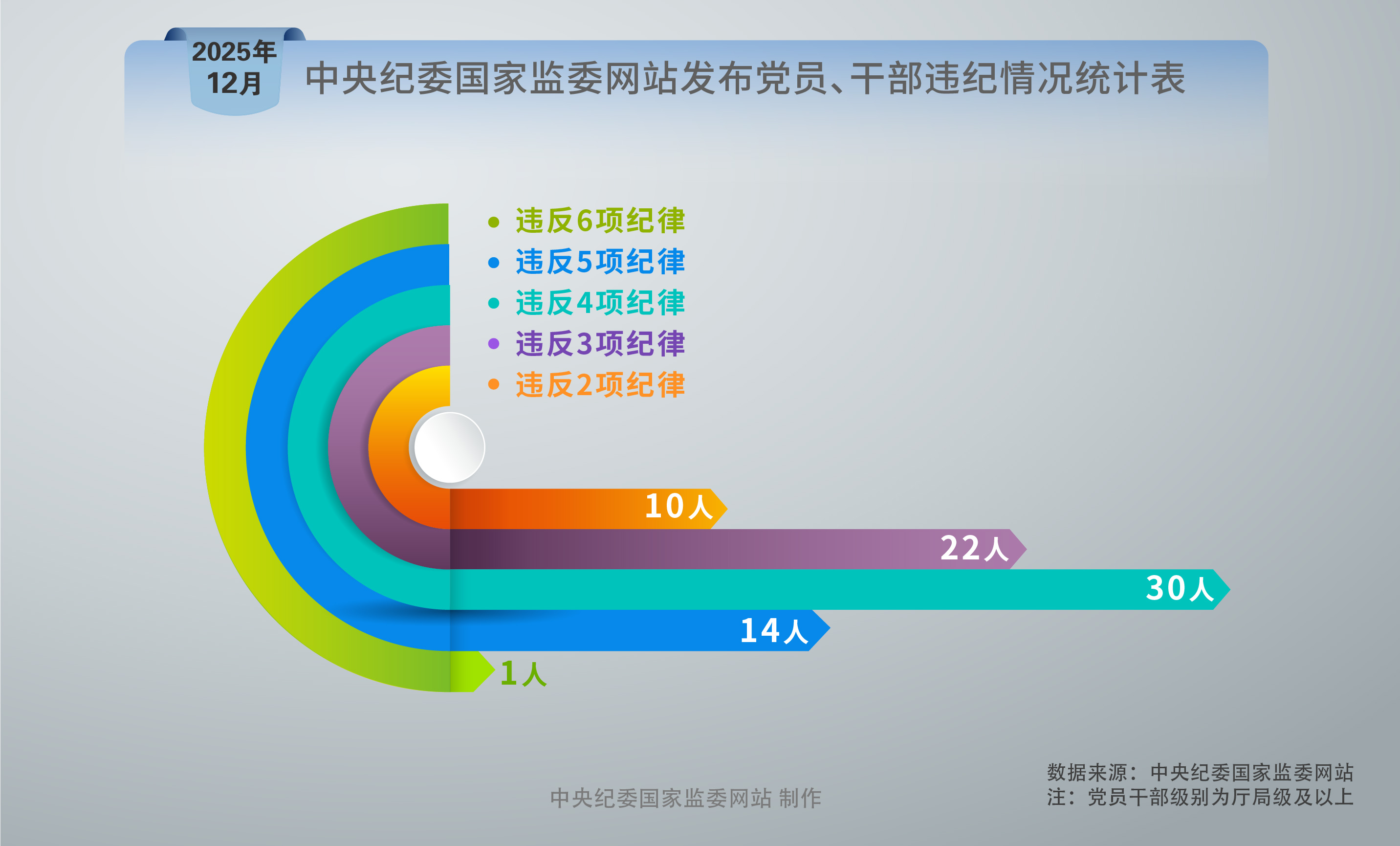 2025年12月,在中央纪委国家监委网站发布的党纪政务处分信息中,被处分党员、干部多数违反多项纪律。违反6项纪律的1人,违反5项纪律的14人,违反4项纪律的30人,违反3项纪律的22人,违反2项纪律的10人。