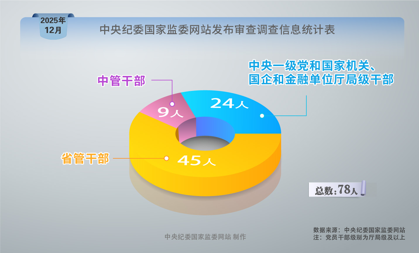 2025年12月,中央纪委国家监委网站共发布78条审查调查信息。其中,中管干部9人,中央一级党和国家机关、国企和金融单位厅局级干部24人,省管干部45人。