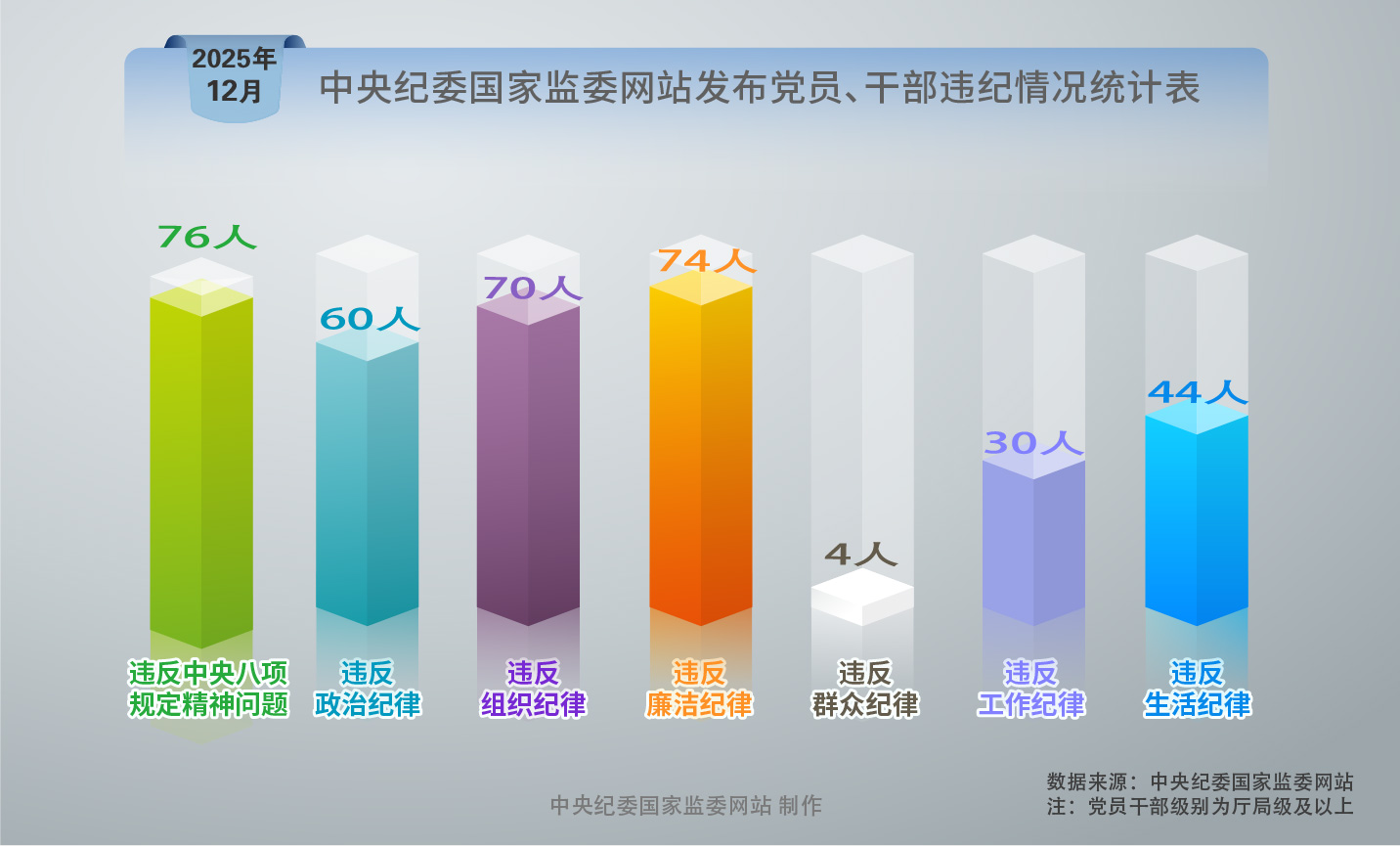 2025年12月,中央纪委国家监委网站发布的78条党纪政务处分信息中,76人违反中央八项规定精神,74人违反廉洁纪律,70人违反组织纪律,60人违反政治纪律,44人违反生活纪律,30人违反工作纪律,4人违反群众纪律。