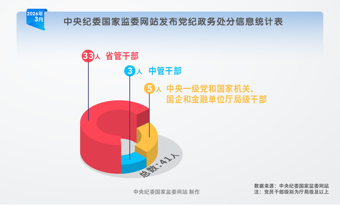 2026年3月,中央纪委国家监委网站共发布41名党员、干部党纪政务处分信息。其中,中管干部3名,中央一级党和国家机关、国企和金融单位厅局级干部5名,省管干部33名。
