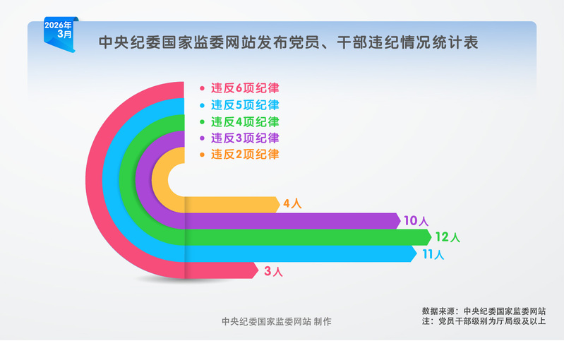 2026年3月,在中央纪委国家监委网站发布的党纪政务处分信息中,被处分党员、干部大多违反多项纪律。违反6项纪律的3人,违反5项纪律的11人,违反4项纪律的12人,违反3项纪律的10人,违反2项纪律的4人。