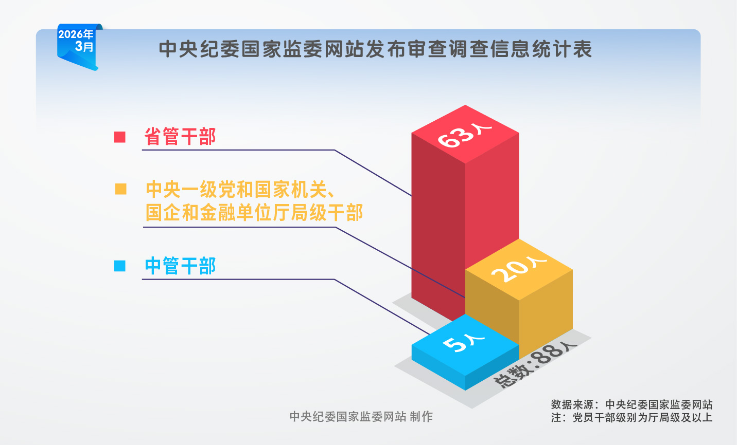 2026年3月,中央纪委国家监委网站共发布88名党员、干部接受审查调查信息。其中,中管干部5名,中央一级党和国家机关、国企和金融单位厅局级干部20名,省管干部63名。