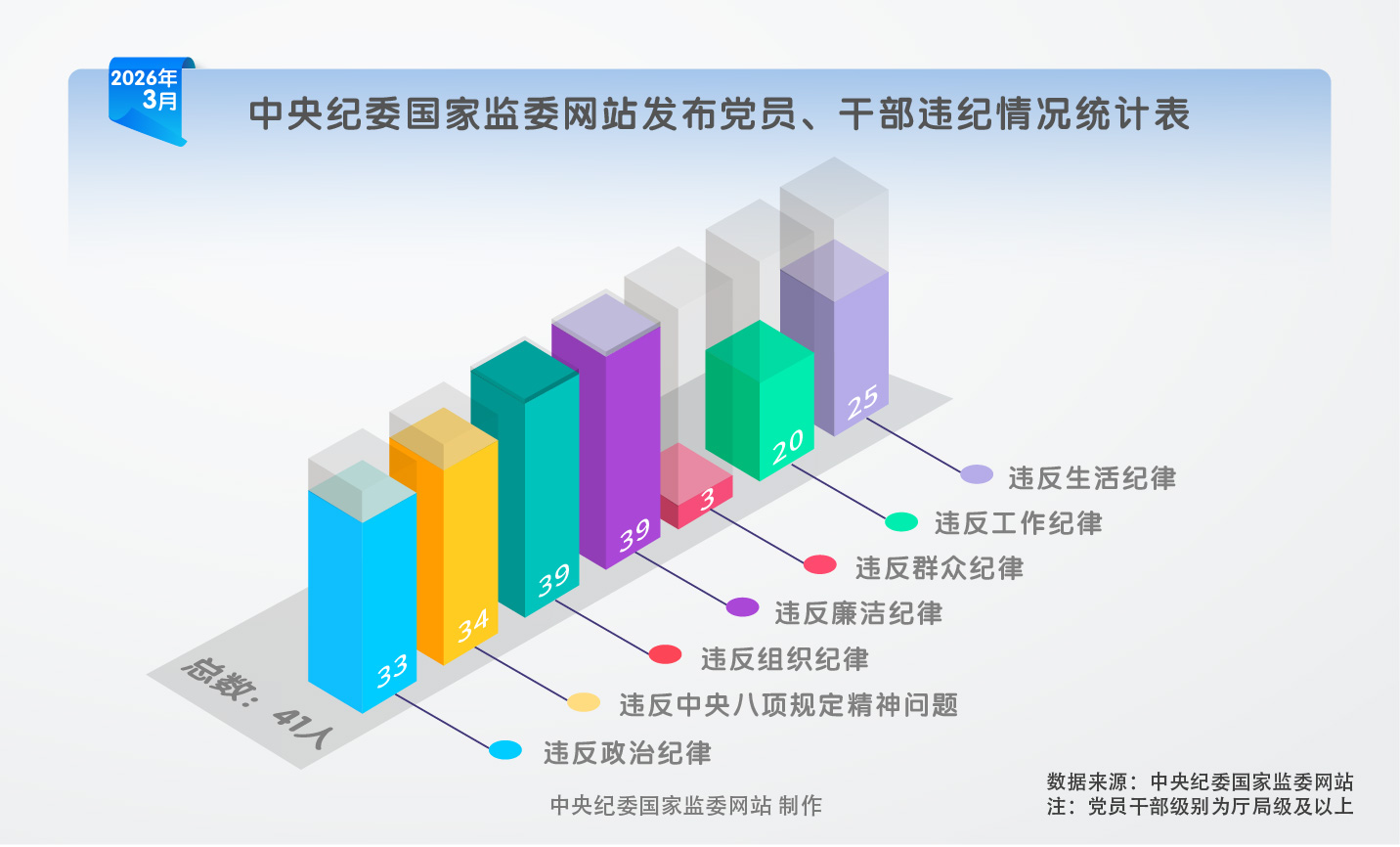 2026年3月,中央纪委国家监委网站通报的41名被处分党员领导干部中,33人违反政治纪律,34人违反中央八项规定精神,39人违反组织纪律,39人违反廉洁纪律,3人违反群众纪律,20人违反工作纪律,25人违反生活纪律。